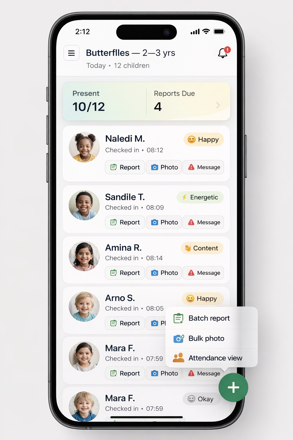 Send beautiful daily reports covering meals, naps, activities, and mood — individually or in batches.